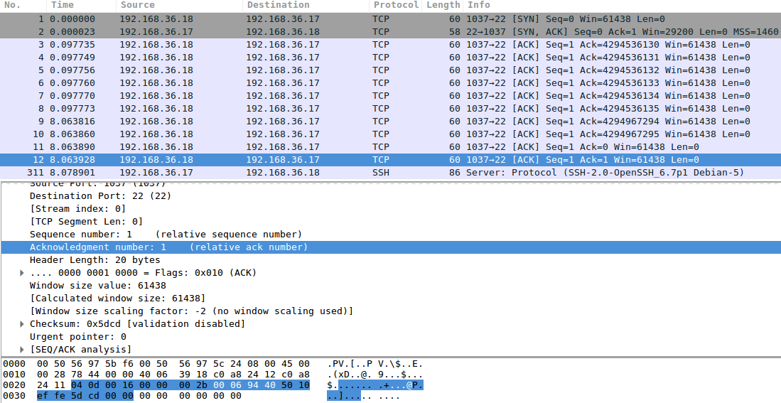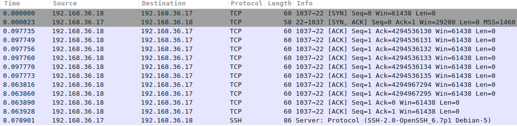 I filtered out the relevant packets, as captured by the target: 192.168.36.17. The first packet is the initial hello, sent by 192.168.36.11, spoofing 192.168.36.18. Our target responds to the fake IP address, and what happens next is that the tool starts guessing the right acknowledgement number. Note the time jump from 0.x seconds to 8.x seconds, here I filtered out a number of attempts. At some point, the number goes from 2^32 (4.x billion) to zero, this is because Wireshark gives us relative numbers. It also means we've found the right number. Relative acknowledgement number 1 is the one we need to have! After receiving that one, the SSH server responds with its banner, as an SSH server always does upon receiving a valid TCP connection.